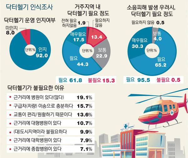 닥터헬기에 대한 시민 인식이 부정확한 것이 현실이다. 국립중앙의료원이 2022년 전국 17개 시도 성인 남녀 1천명을 대상으로 진행한 ‘닥터헬기 인식 조사 결과 보고서’를 보면 닥터헬기가 격오지 주민만을 위한 것으로 오해하고 있다는 사실이 확인된다. 조사에서 거주지에 닥터헬기가 필요하지 않다고 응답한 비율은 15.3%였다. 불필요한 이유로는 ‘근거리에 병원이 있다(많다)’ ‘구급차(차량) 이송으로 충분하다’ ‘교통이 편리/원활하다’는 식의 응답이 대부분이다.