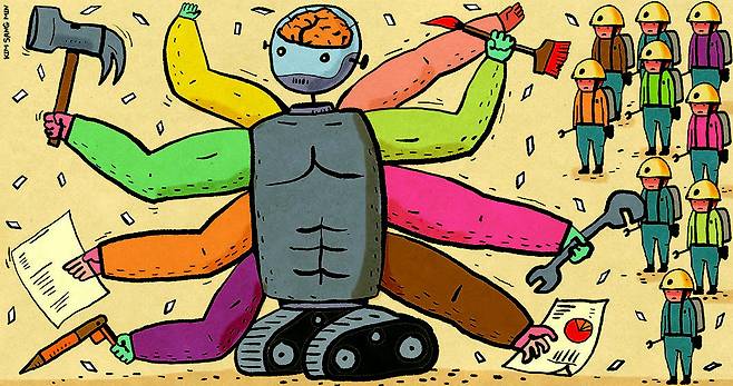 문제는, 지금 당장을 사는 우리들 대부분은 그러한 세상의 준비와 훈련이 거의 혹은 전혀 되어 있지 않다는 것이다. 20세기 이후 산업사회는 인구 대부분을 돈 얼마 주고 일 시키면 군말 없이 결과물을 가져오는 임노동자로 키워내도록 설계돼 있고 또 그렇게 작동해왔으며, 대다수의 우리들은 그렇게 살아가고 일하는 것을 노동이요 경제 활동이라고 생각하며 살아왔다. 그런데 그런 우리들더러 인공지능과 로봇으로 좋은 세상이 왔으니 그런 힘든 짓 하지 말고 세상을 잘 관찰해 스스로 인간 세상에 기여할 수 있는 바를 알아서 찾아내어 뭔가 해보라고? 인공지능 때문에 졸지에 대량해고를 겪은 콜센터 노동자들에게 6개월 동안 실업수당을 줄 터이니 푹 쉬면서 인공지능과 로봇을 활용하는 혁신적인 1인 기업을 열어보라고?