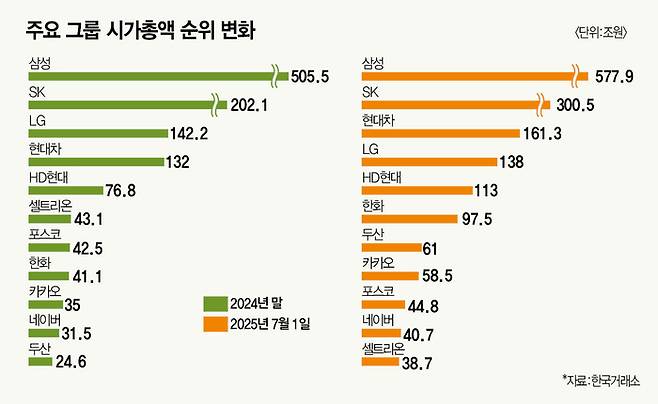 반면 국내 그룹사 4위인 LG그룹 시총은 우하향 중이다. 2023년 말 186조원, 지난해 말 142조원을 기록한 데 이어 현재 138조원에 머물고 있다. 그룹 내 핵심 계열사 LG에너지솔루션이 2차전지 분야에서 중국 기업의 기술과 가격 경쟁력에 어려움을 겪으며 주가 부진이 장기화된 탓이다. 7월 1일 기준 LG에너지솔루션 주가는 30만2500원으로 1년 전(34만7000원)과 비교하면 12.8% 떨어졌다. 또 다른 핵심 계열사 LG전자도 마찬가지다. 가전 사업 부진으로 7월 1일 기준 주가는 7만6200원에 머물고 있다. 1년 전(10만9600원) 대비 30.4% 하락이다.