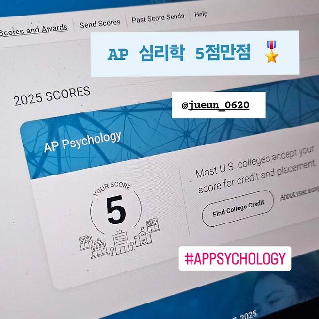 이와 함께 첫째 딸 주은 양이 AP 심리학에서 만점을 획득한 인증 사진을 공개해 놀라움을 자아냈다. AP 심리학은 미국 칼리지보드에서 주관하는 고등학교 심리학 교육과정 및 표준화 시험으로, Advanced Placement 과목 중 하나다.