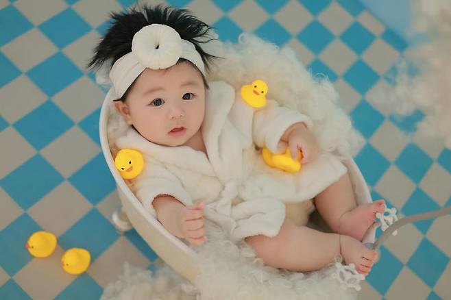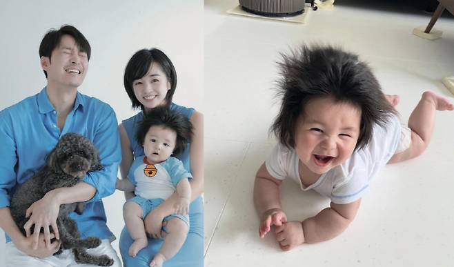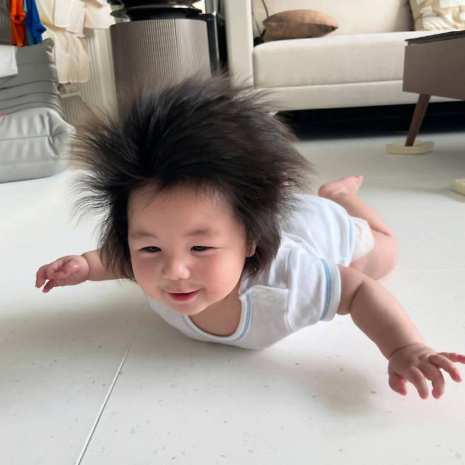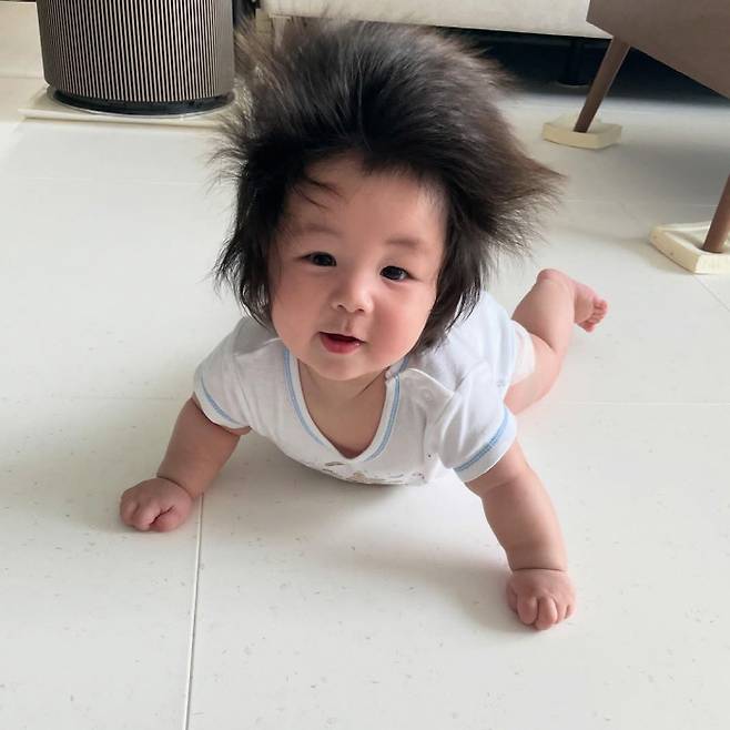 사진 속에는 6개월 된 아들의 일상 모습이 담겨있다. 바닥에 누워 엄마와 아빠를 응시 중인 아들. 이어 눈웃음 가득한 환한 미소를 선보이며 엄마와 아빠를 웃게 만들었다.