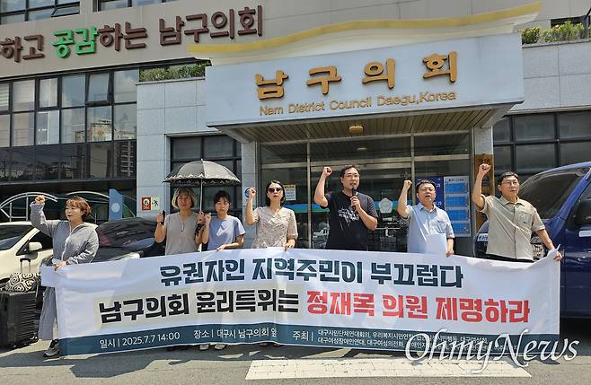 대구시민단체연대회의와 우리복지시민연합 등 9개 시민단체들은 이날 남구의회 앞에서 기자회견을 열고 "유권자인 지역주민이 부끄럽다"며 "남구의회는 정 의원을 제명하라"고 촉구했다.