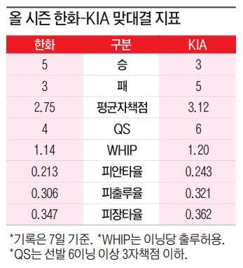 올 시즌 두 팀의 맞대결 전적은 한화의 5승 3패 우위. 8경기 중 7경기에서 2점 차 이내 희비가 엇갈렸다. 지난달 6일 광주 3연전에선 3경기 모두 1점 차 승부가 펼쳐질 정도로 호각세였다.