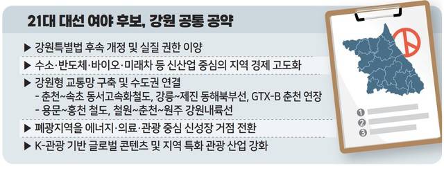 21대 강원 대선에서 이재명 대통령과 국민의힘 김문수 전 후보는 광역 철도망 구축을 비롯해 강원특별법 3차 개정, 폐광지역 대체산업 육성, 미래산업 기반 조성 등을 동시에 약속했다.