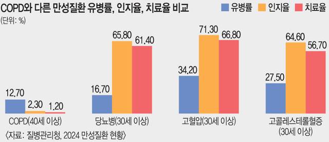 2023년 기준 국내 40세 이상의 COPD 유병률은 약 12.7%(남성 18.6%, 여성 7.1%)이지만 다른 만성질환과 비교해 질병 인지율은 2.3%, 치료율은 1.2%로 한 자릿수에 불과하다. 그만큼 ‘숨어있는 환자’가 많을 수 있다는 뜻이다. 유광하 결핵·호흡기학회 이사장은 “그나마도 50대 이상과 달리 40대는 거의 치료를 받지 않고 있는 실정”이라고 전했다.