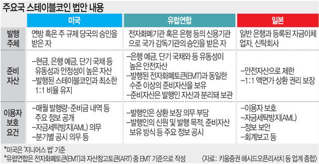세계 스테이블코인 시장에서 점유율 대부분을 차지하는 미국은 민간의 스테이블코인 발행을 허용하는 형태로 법제화 작업이 이뤄지고 있다. 반면 유럽연합(EU)과 일본은 전통 금융기관에 한해 스테이블코인을 발행하게 하는 제한적인 접근을 취하고 있다. 한국의 경우 현재로서는 일본과 유럽 모델을 따라갈 가능성이 크다는 시각이 우세하다.
