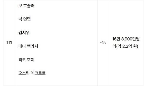 김시우는 공동 11위로 약 2억 3,317만 원 상금을 받는다.