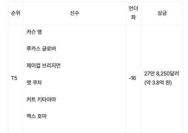 이하 선수들의 상금은 다음과 같다. (T= 공동 순위)
