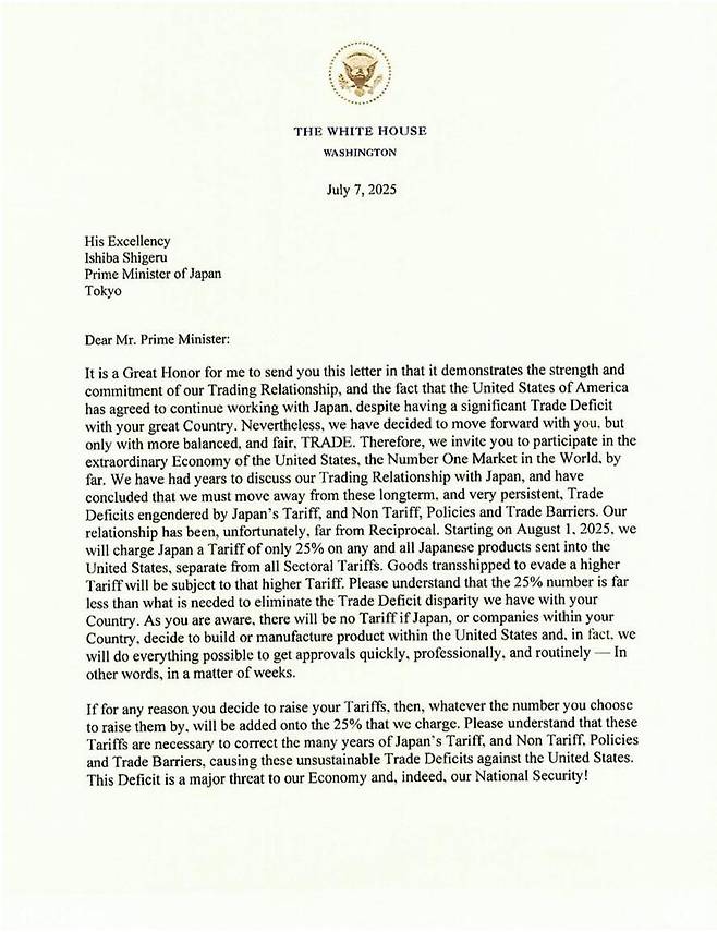 이시바 시게루 일본 총리에게 보낸 이 서한에서 트럼프 대통령은 미국의 대(對)일본 무역적자를 강조하면서, 일본이 이번 관세에 맞서 대미 관세를 올리면 미국도 그만큼 관세율을 더 올릴 것이라고 경고했습니다.