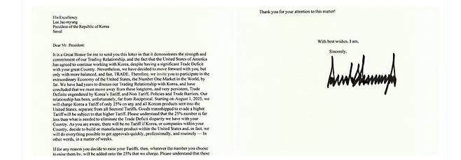트럼프 대통령은 서한에서 "이 서한을 보내게 돼 매우 영광"이라며 "이는 한미간 무역관계의 강력함과 상호 헌신을 보여주는 동시에, 미국이 한국과의 상당한 무역적자에 불구하고 협력을 계속하기로 했다는 점을 의미한다"고 밝혔다.