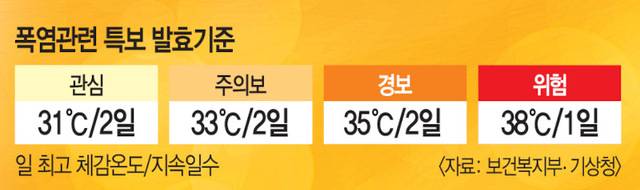 기상청은 하루 중 최고 체감온도가 33도 이상인 상황이 2일 이상 지속되면 폭염주의보, 체감온도 35도 이상이 2일 이상 지속되면 폭염경보를 발령한다. 급격한 체감온도 상승 또는 폭염 장기화 등으로 중대한 피해가 예상될 때도 폭염특보가 발령된다.