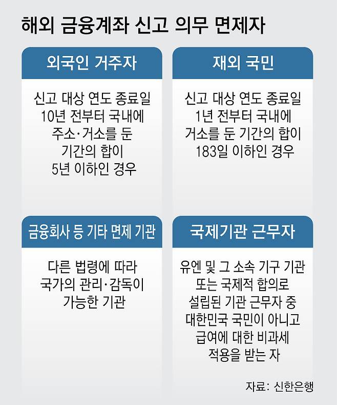 해외 금융계좌 잔액의 합이 5억 원을 초과하면 그 금융계좌 정보를 관할 세무서에 신고해야 한다. 해외 금융계좌 내 가상자산, 현금, 주식, 채권, 파생상품(주가연계증권 등), 펀드 등의 원화 환산 잔액이 지난해 매월 말일 기준 5억 원을 한 번이라도 넘었다면 신고 대상에 해당한다. 신고 의무자는 신고 대상 연도 종료일(2024년 12월 31일 기준) 현재 거주자 또는 국내 법인으로 신고의무 면제자에 해당하지 않는 사람이다. 다만 외국인 거주자, 재외국민, 국제기관 근무자, 기타 면제기관 등의 경우 일정 요건 충족 시 신고 의무 면제를 받을 수 있다.