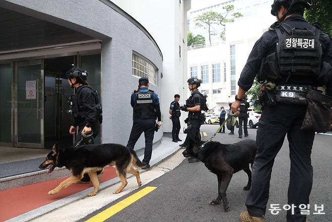 | 경찰특공대-폭발물 탐지견 출동, 교내외 수색 7일 서울 성북구 성신여대에 폭발물을 설치했다는 이메일 신고가 접수돼 경찰특공대 등이 교내외를 수색하고 있다. 같은 시각 광주여대에서도 유사한 신고가 접수됐다. 경찰은 동일범의 소행일 가능성에 무게를 두고 수사 중이다. 신원건 기자 laputa@donga.com |