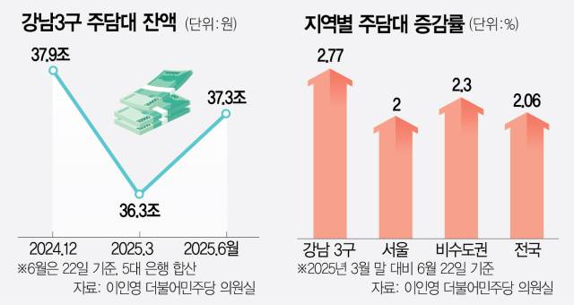 7일 국회 정무위원회 소속 이인영 더불어민주당 의원이 5대 시중은행(KB국민·신한·하나·우리·NH농협)으로부터 제출받은 자료에 따르면 이들 은행의 강남 3구 주담대 잔액은 지난달 22일 기준 총 37조 2770억 원으로 조사됐다.
