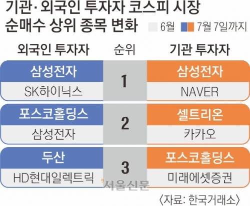 기관 투자자들과 외국인 투자자들의 주문 내역도 크게 다르지 않다. 외국인 순매수 규모 1, 2위에는 삼성전자와 포스코홀딩스가 자리했다. 기관 투자자들은 삼성전자와 셀트리온, 포스코홀딩스를 순서대로 가장 많이 사들였다. 큰손들의 자금 유입에 힘입어 포스코홀딩스(+20.11%)와 삼성전자(+3.18%), LG화학(+22.70%), 셀트리온(+12.03%)의 주가는 이달 들어 모두 큰 폭으로 올랐다. 이들은 미국과의 관세 협상이 성공적으로 이뤄질 경우 수혜가 예상되는 대표 종목들이다.