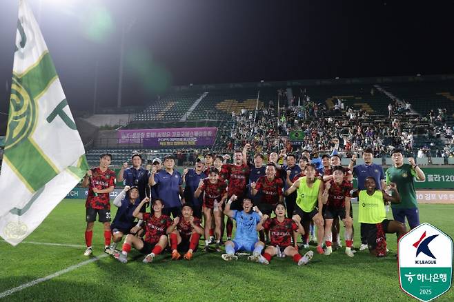 선두권을 흔드는 게 부천이라면, 중위권 판도의 중심에는 김포가 있다. 김포는 6일 김포솔터축구장에서 열린 부산 아이파크와의 경기에서 3대0 완승을 거뒀다. 시즌 6승(6무7패) 고지를 밟은 김포는 승점 24점으로 8위까지 뛰어올랐다. 플레이오프 마지노선인 5위 부산(승점 30)과의 승점차를 6점으로 줄였다.