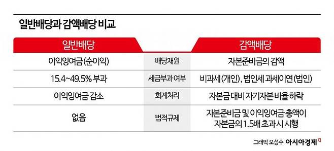 감액배당은 기업이 자본잉여금 중 '자본준비금'을 줄여 이익잉여금으로 전환한 후 이를 배당 재원으로 사용하는 방식이다. 회계상 자본을 줄여 주주에게 돌려주는 '자본환급'으로 간주해 비과세 처리된다. 회사 수익이 아닌 주주가 낸 출자금 일부를 반환하는 셈이기 때문이다. 기업 입장에서는 감액배당을 통해 이익잉여금이 아닌 자본준비금으로 배당 재원을 마련할 수 있고, 주주 입장에서는 배당금을 비과세로 수령할 수 있다는 게 특징이다.