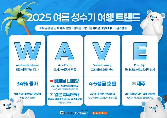 글로벌 호텔 검색 플랫폼 호텔스컴바인과 글로벌 여행 검색 엔진 카약이 2025년 7월 1일부터 8월 31일까지 한국인 여행객의 해외 항공권·호텔 및 국내 호텔 검색 데이터를 분석해 여름 성수기 여행 트렌드 ‘W.A.V.E’를 발표했다.