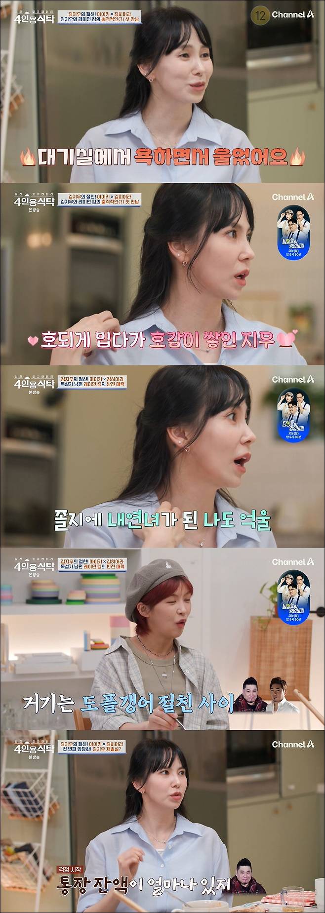 7일 방송된 채널A '절친 토큐멘터리-4인용 식탁'은 김지우 편으로 꾸며졌다. 아이키와 김히어라가 함께한 가운데 김지우는 남편 레이먼킴과 교제하던 중 김조한과 뜬금없는 불륜설에 휘말렸다고 고백해 눈길을 끌었다.