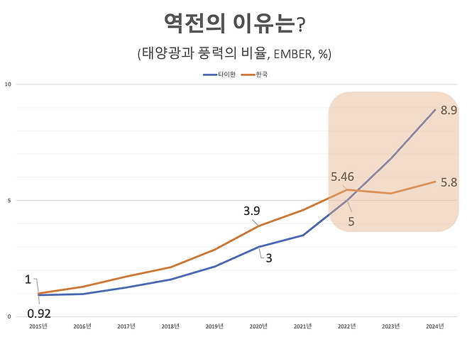 한국이 타이완에 역전당했다. 전체 전력 발전량에서 태양광과 풍력이 차지하는 비중 얘기다. 타이완의 경우 9%에 육박한다. 2020년 3%에서 단 4년 만에 8.9%, 거의 3배가 됐다.
