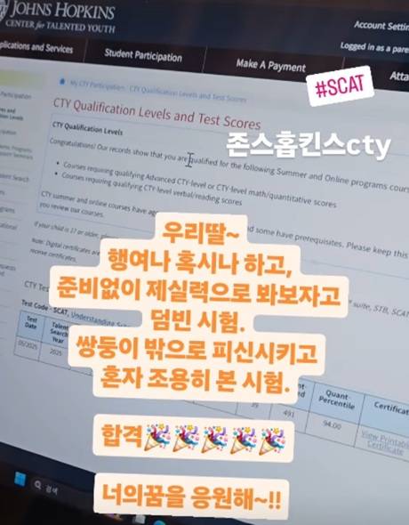 지난 5월, 심하은은 "존스홉킨스 cty. 우리딸 행여 혹시나 하고, 준비없이 제 실력으로 봐보자고 덤빈 시험. 쌍둥이 밖으로 피신시키고 혼자 조용히 본 시험 합격! 너의 꿈을 응원해"라는 글과 함께 영상을 게재했다.