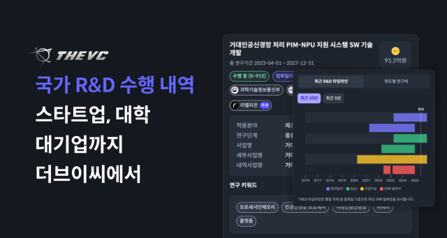 자본시장 DB 기업 ‘더브이씨(The VC)’가 국가 연구개발(R&D) 과제 데이터를 기반으로 딥테크 스타트업의 기술 역량을 분석할 수 있는 신규 기능을 출시했다고 8일 밝혔다.