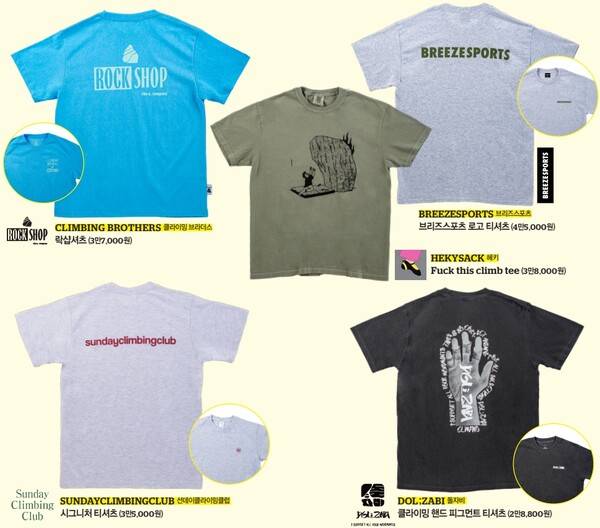 클라이밍이 유행하며 자연스럽게 클라이밍 패션에 대한 관심이 커졌다. 클라이밍용 바지나 티셔츠를 만드는 브랜드들이 늘어갔다. 암장들은 티셔츠를 굿즈처럼 제작했다. 평소 다니는 주 암장이 아닌 다른 암장으로 원정을 떠나 그 암장의 티셔츠를 사오는 문화도 생겼다. 클라이밍 크루들은 자기들만의 로고와 이미지를 만들어 티셔츠에 넣었다. 특색 있는 티셔츠들이 하나 둘 생겨났다.