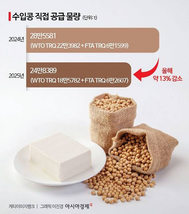 수입관리 품목으로 정부가 공급을 통제하고 있는 콩은 '저율관세할당(TRQ)' 제도를 통해 세계무역기구(WTO) TRQ와 자유무역협정(FTA) TRQ 물량을 공급한다. 매년 약 28만t을 공급하는데 이 중 75% 이상을 차지하는 WTO 물량에서 기본 물량만 공급하고 증량을 하지 않아 약 3만8000t이 부족하게 된 것이다. 수입 콩 사용 업계는 국영무역이나 수입권 공매 등을 통해서도 일부 원료를 조달할 수 있지만, 이 물량 역시 지난해보다 감소했다는 설명이다.