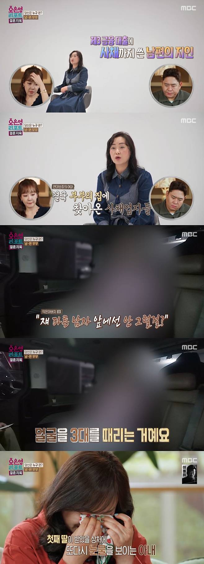 이날 아내는 남편의 재정을 정확히 모른다며 남편이 아내와 상의 없이 대출을 받고 연대보증까지 섰다고 알려져 큰 충격을 안겼다. 또 남편은 제3 금융 대출에 사채까지 써 사채업자가 집에 찾아왔다고도 전했다.
