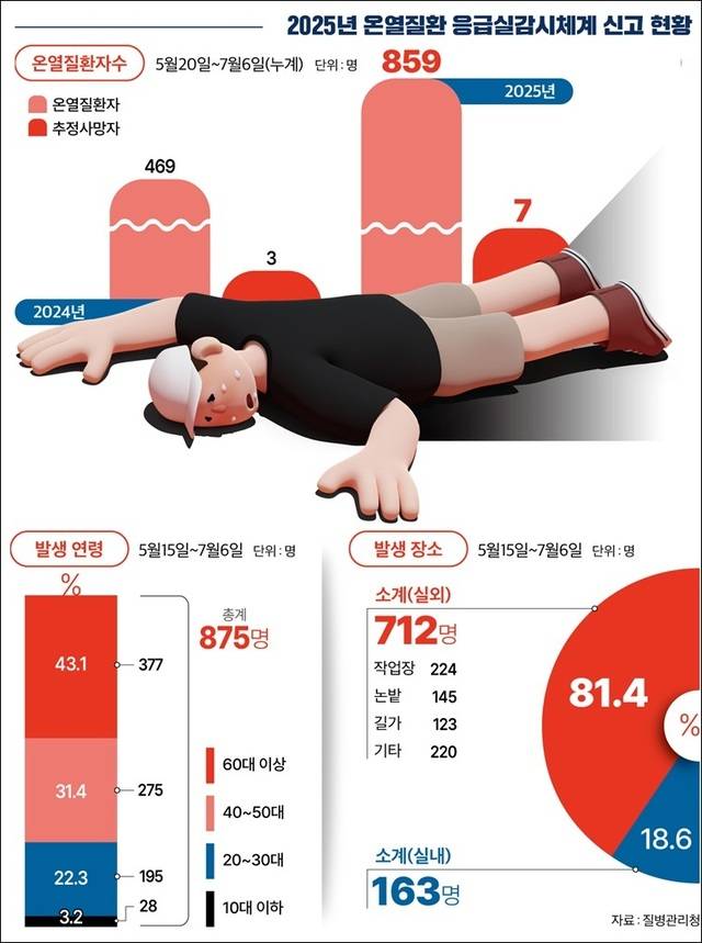질병관리청에 따르면 5월20일부터 7월6일까지 온열질환자는 총 859명으로 지난해 같은 기간(469명)보다 83%나 증가했다. 사망자수도 7명으로 지난해(3명)에 비해 크게 늘었다. 온열질환 발생 장소(5월15일∼7월6일 기준)는 실외(712건)가 실내(163건)보다 압도적으로 많았고, 실외에서는 작업장(224건)·논밭(145건)·길가(123건) 순으로 발생 빈도가 높았다. 연령별로는 60대 이상이 377명으로 43.1%를 차지했고, 40∼50대는 275명, 20∼30대가 195명으로 뒤를 이었다.