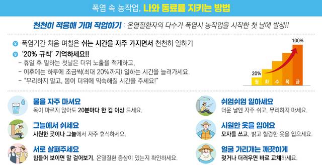 폭염특보 발령 시 정부와 지방자치단체가 재난문자를 보내고 예방법을 홍보하는 등 대책 마련에 나섰지만 역부족이다. 농민들은 시기에 맞춰 해야만 하는 농작업이 있기 때문이다. 지역에 따라 6월28일 이후 거의 매일 폭염경보가 발령될 만큼 무더위가 지속되고 있지만 농민들이 밭으로 향하는 이유다. 농촌 마을 곳곳을 다니며 온열질환 예방수칙을 안내하고 있는 한국생활개선진주시연합회 회원들은 여전히 땡볕에도 무방비로 농작업을 하는 농민들을 종종 마주친다고 했다.