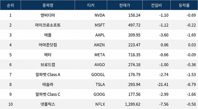 엔비디아(NVDA)는 158.24달러로 전일 대비 0.69% 하락했다. 애플(AAPL)은 209.95달러로 1.69% 하락하며 상대적으로 큰 하락폭을 기록했다. 알파벳 Class A(GOOGL)는 176.79달러로 1.53% 하락했다.