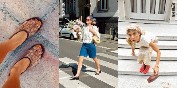 가죽이나 나일론, 루프 소재가 질린다면 젤리 소재 메시 슈즈로 분위기를 전환해볼 것. 컬러의 귀재라 불리는 콘텐츠 크리에이터 이네스 이사이아스는 상·하의와 액세서리를 모두 차분한 뉴트럴 톤으로 매치한 뒤 그물망 형태의 레드 컬러 젤리 슈즈로 포인트를 줘 룩에 위트를 더했다.