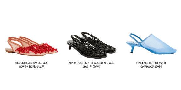 단조로운 라인의 메시 슈즈는 투박한 듯 부드러운 분위기를 연출한다.