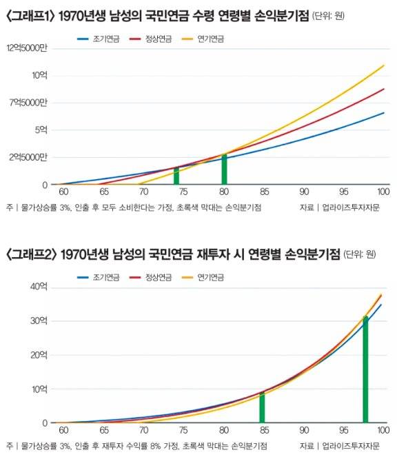물가상승률을 3%로 가정하고 누적 수령액을 기준으로 삼을 때 재투자가 없다면 연기연금이, 반대로 8%가량 수익률을 낼 수 있다면 조기연금이 유리하다는 결과가 나왔다.그런데 현장에서 얘기를 들어보면 국민건강보험료(건보료) 부담 때문에 조기연금을 선택했다는 사람이 많다. 별도 소득이 없어도 국민연금 수령액이 연 2000만 원(월 167만 원)을 초과하면 국민건강보험 피부양자 조건에서 탈락해 건보료 부담이 발생한다. 이를 피하고자 조기연금을 선택해 연금 수령액을 줄이는 것이다.
