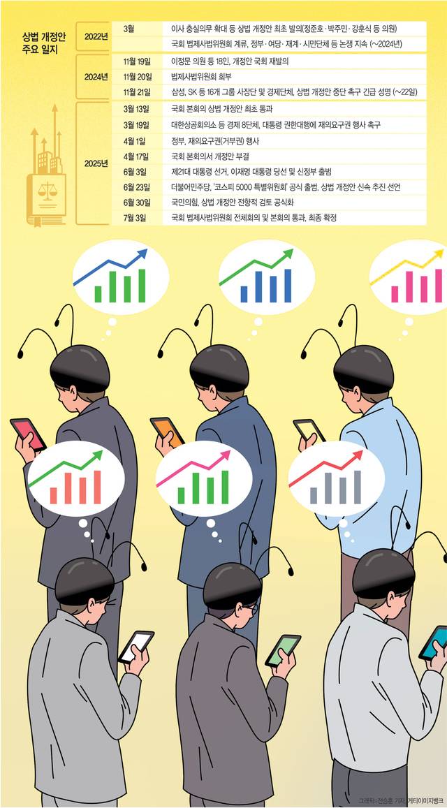 여당은 상법 개정안 통과 직후 집중투표제 의무화, 감사위원 분리선출 확대, 자사주 소각 의무화 등 추가 입법을 예고했다. 김병기 민주당 당 대표 직무대행 겸 원내대표는 상법 개정안이 국회를 통과한 날 정책조정회의에서 “집중투표제와 감사위원 분리 선출 확대도 공청회를 열어서 의견을 수렴한 후 7월 임시국회 내에 처리하도록 최선을 다하겠다”고 말했다. 야당과의 합의 처리를 위해 당초 법안에서 빠졌던 조항도 추가로 개정을 추진하겠다는 의지다.