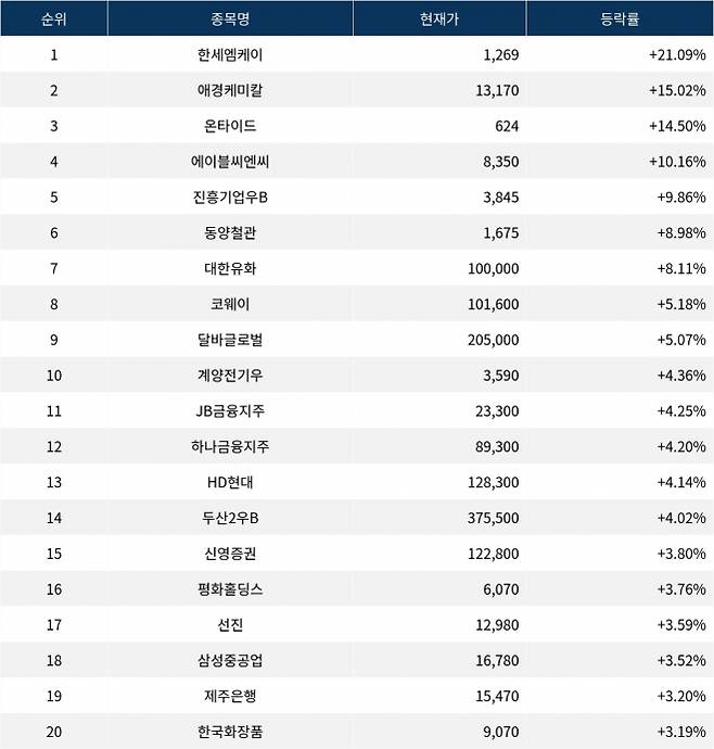 이어 상승률 2위 애경케미칼(161000)은 현재가 13,170원으로 주가가 15.02% 급등하고 있다. 상승률 3위 온타이드(005320)는 현재 624원으로 14.50% 급등하며 활발한 거래를 보이고 있다. 상승률 4위 에이블씨엔씨(078520)는 10.16% 상승하며 8,350원에 거래되고 있다. 상승률 5위 진흥기업우B(002785)는 9.86%의 상승세를 보이며 3,845원에 거래되고 있다.