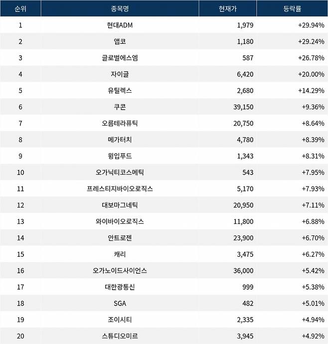 6위 쿠콘(294570)은 현재가 39,150원으로 9.36% 상승 중이다. 7위 오름테라퓨틱(475830)은 현재가 20,750원으로 8.64% 상승 중이다. 8위 메가터치(446540)는 현재가 4,780원으로 8.39% 상승 중이다. 9위 윙입푸드(900340)는 현재가 1,343원으로 8.31% 상승 중이다. 10위 오가닉티코스메틱(900300)은 현재가 543원으로 7.95% 상승 중이다.