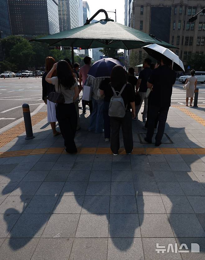 [서울=뉴시스] 최진석 기자 = 폭염이 이어지고 있는 8일 서울 세종대로사거리 인근에서 출근길 시민들이 그늘막 아래로 들어가 햇볕을 피하고 있다. 2025.07.08. myjs@newsis.com