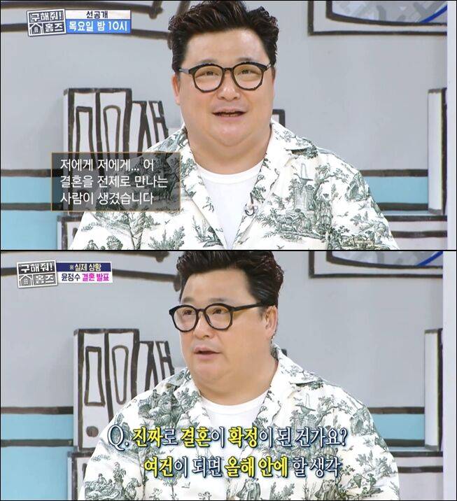 윤정수는 8일 오전 공개된 MBC '구해줘! 홈즈' 예고편에서 직접 결혼 소식을 밝혔다. 예고편에서 그는 "제게 결혼을 전제로 만나는 사람이 생겼다"라며 "여건이 되면 올해 안에 할 생각이다. 그쪽 어르신들을 다 만나 뵈었다"고 말했다.