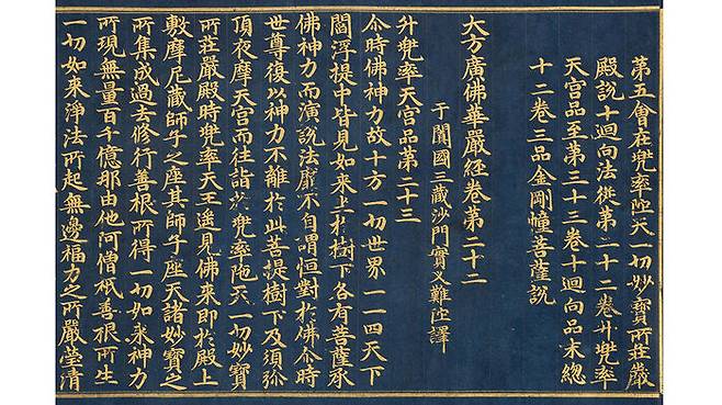 감지금니 대방광불화엄경 주본 권22는 짙은 청색의 종이에 금가루를 아교풀에 개어 만든 안료로 필사한 고려시대 사경입니다.