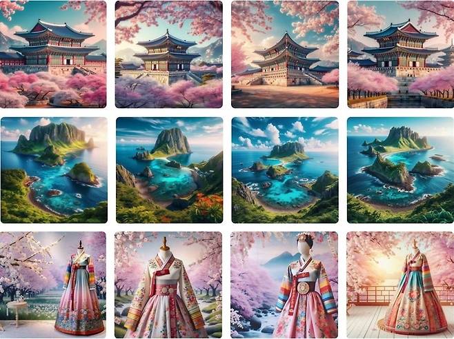 | ▲ 생성형 AI 플랫폼에서 한국의 역사·문화유산 관련 이미지를 요청했을 때 잘못된 정보가 나오는 모습. 상단이 경복궁이고 중간이 독도, 맨 아래가 한복 이미지인데 모두 실제와는 다른 모습이다. |
