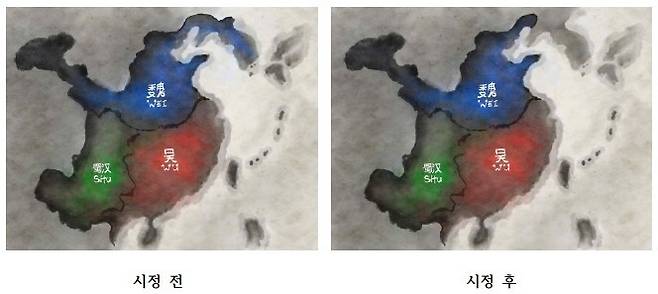 | ▲ 게임속 삼국시대 조위(曹魏)의 영토가 한반도 전역을 포함한 것처럼 그려진 모습과 시정후의 모습. |