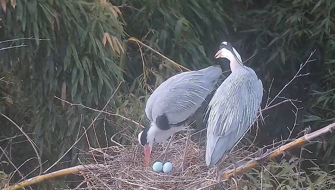 이어 3월 21일에는 암컷 왜가리(머리 깃이 짧음)가 1개의 알을 낳는 장면이 포착됐으며, 27일 오후 2시 50분경 두 번째 알을 낳는 장면이 관찰됐다. 29일에는 세 번째 알을 낳아 암수가 교대로 알을 품기 시작했다.