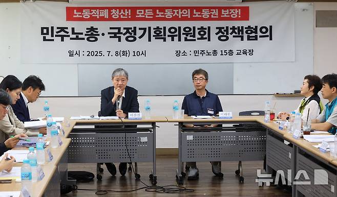 [서울=뉴시스] 최진석 기자 = 이찬진 국정기획위원회 사회1분과장이 8일 서울 중구 정동 민주노총 교육장에서 열린 민주노총·국정기획위원회 정책협의에서 발언하고 있다. 오른쪽은 이태환 민주노총 수석부위원장. 2025.07.08. myjs@newsis.com