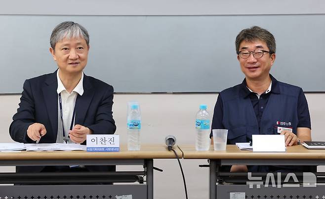 [서울=뉴시스] 최진석 기자 = 이찬진(왼쪽) 국정기획위원회 사회1분과장과 이태환 민주노총 수석부위원장이 8일 서울 중구 정동 민주노총 교육장에서 열린 민주노총·국정기획위원회 정책협의에 참석하고 있다. 2025.07.08. myjs@newsis.com