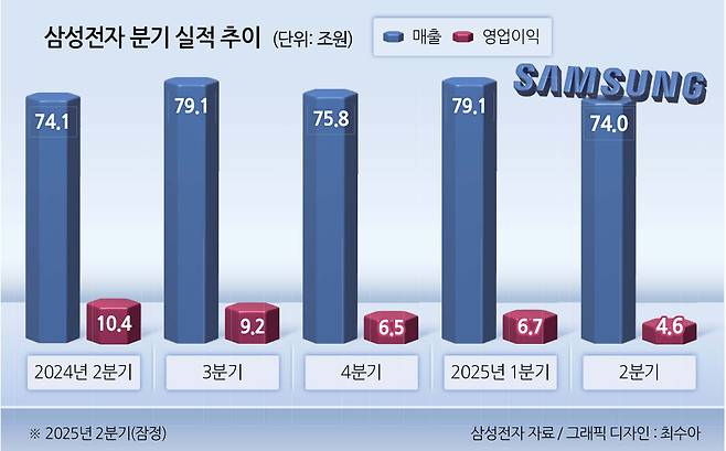 ▶HBM 매출 감소, 파운드리 2조 적자에 발목=삼성전자가 8일 발표한 2분기 잠정 영업이익 4조6000억원은 시장 예상치인 6조3000억원을 27% 밑도는 저조한 실적이다. 사업부별 실적은 공개하지 않았지만 특히 반도체 부문의 실적 개선 폭이 당초 기대에 미치지 못했다는 평가가 나온다.