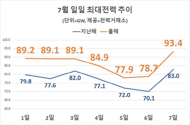 이 추세라면 오늘 하루 만에 전날 기록했던 올해 최대 전력수요 수치를 다시 한번 넘어설 전망이다. 기상청은 오늘 서울 낮 최고기온을 36도로 전망했다. 전력거래소는 오늘 전력계통의 부하(전력수요)가 오후 5~6시께 최대 93.9GW로 전날보다 0.5GW 더 늘어날 것으로 전망하고 있다.