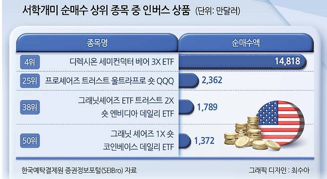 하지만 서학개미들은 오히려 주가 하락에 베팅하는 인버스 상품을 대거 사들인 것으로 나타났다.
