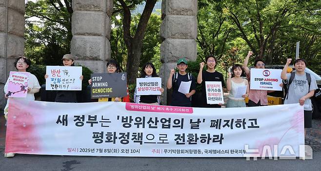 [서울=뉴시스] 이영환 기자 = 무기박람회저항행동, 국제앰네스티 한국지부 관계자들이 8일 오전 서울 용산구 그랜드하얏트 서울 앞에서 열린 방위산업의 날 폐지 촉구 기자회견에서 구호를 외치고 있다. 2025.07.08. 20hwan@newsis.com